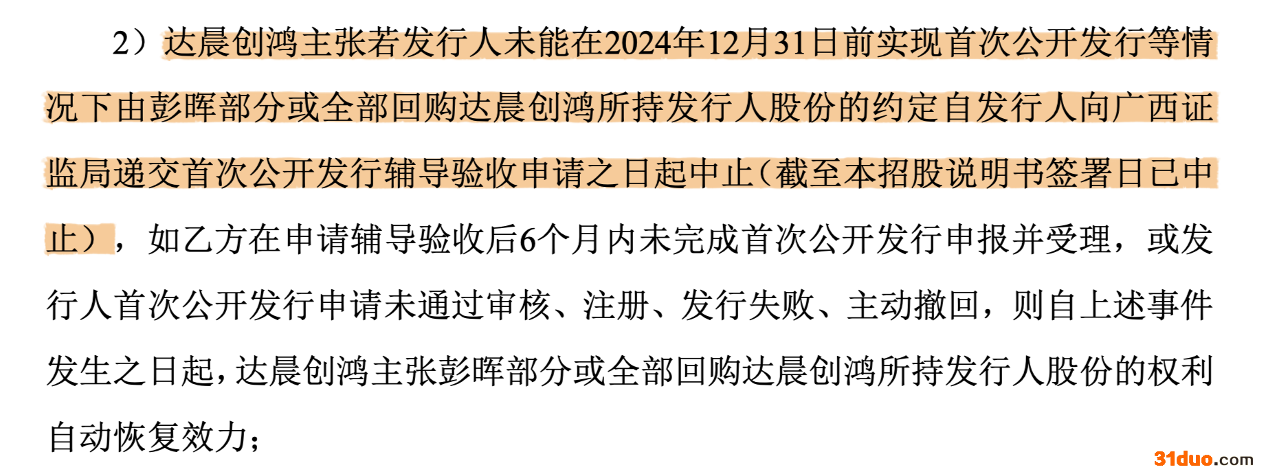 图|光隆科技招股书关于对赌协议恢复条件的描述
