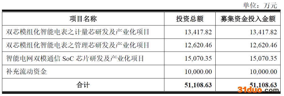 此次IPO,钜泉光电发行不超过1440万股,拟募资5.11亿元。其中,双芯模组化智能电表之计量芯研发及产业化项目拟投入1.34亿元、双芯模组化智能电表之管理芯研发及产业化项目1.26亿元、智能电网双模通信SoC 芯片研发及产业化项目1.5亿元。
