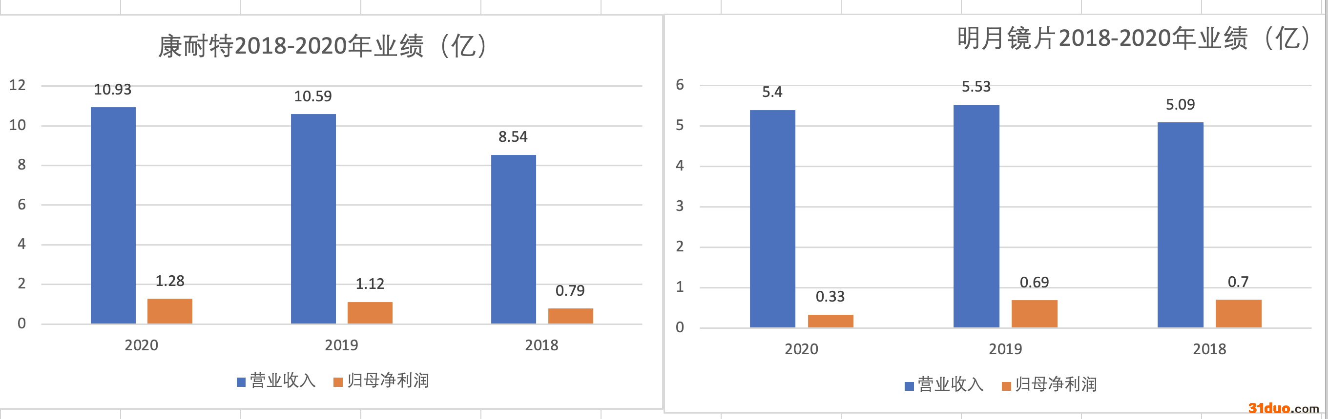 从直观的业绩表现来看,康耐特近三年的业绩表现远远好于明月镜片:2018年-2020年,康耐特的营收分别是8.54亿元、10.59亿元、10.93亿元;归母净利润分别是7846万元、1.12亿元、1.28亿元。