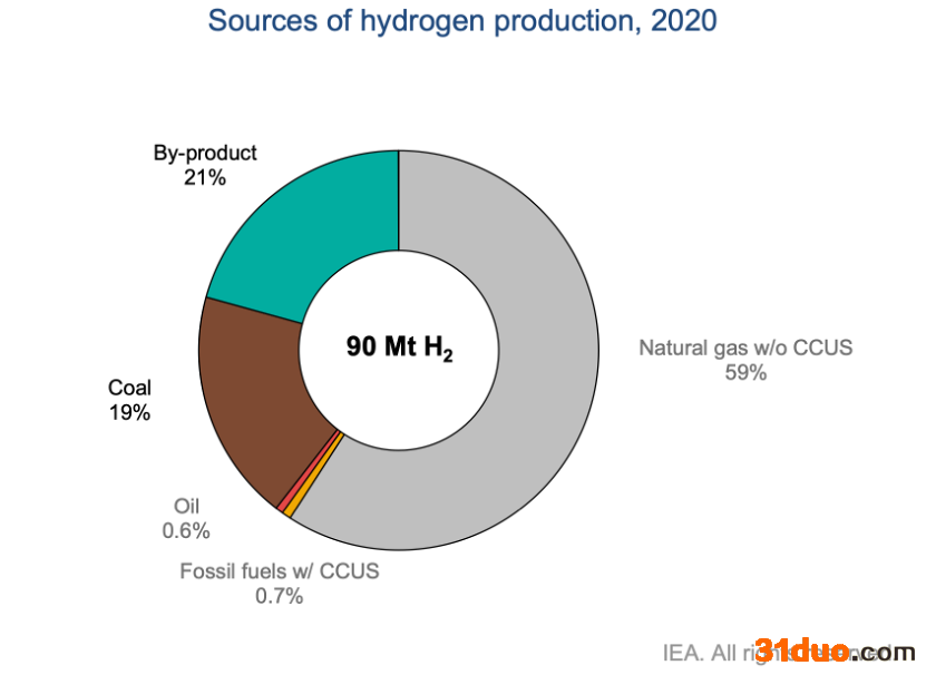 从国际能源署的统计来看,2020年全球生产的氢气,有78.6%是直接由各种化石燃料(59%天然气、19%煤炭、0.6%石油)加工得到的,21%则是化工生产的副产品。