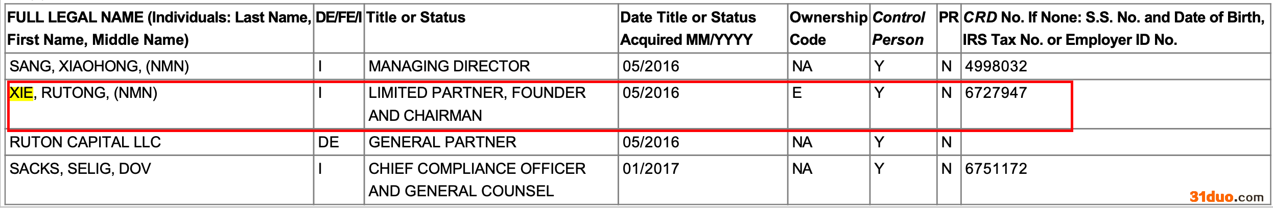 时代财经检索SEC网站披露的文件得知,Ruton Capital的实控人确实为Xie,Rutong(解茹桐)。