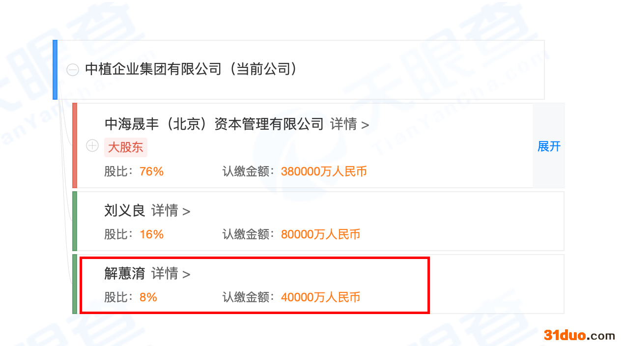 另外,上述文章称,解茹桐又名“解蕙淯”。天眼查显示,解蕙淯正是“中植系”母公司中植企业集团有限公司的唯二自然人股东之一,持有8%的股权。