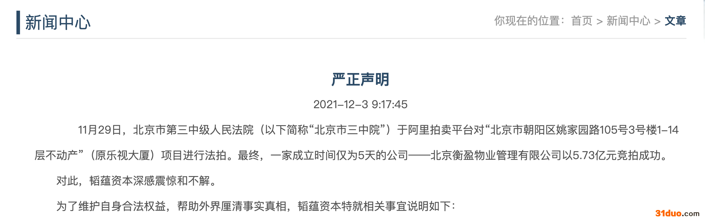 12月3日,韬蕴资本在其官网发布《严正声明》,称已经查明,拍下乐视大厦的公司的资金,系中植系所提供;而长期与韬蕴资本就乐视大厦存在争议纠纷的浙江中泰,实控人为解茹桐,是中植集团实控人解直琨的直系亲属。