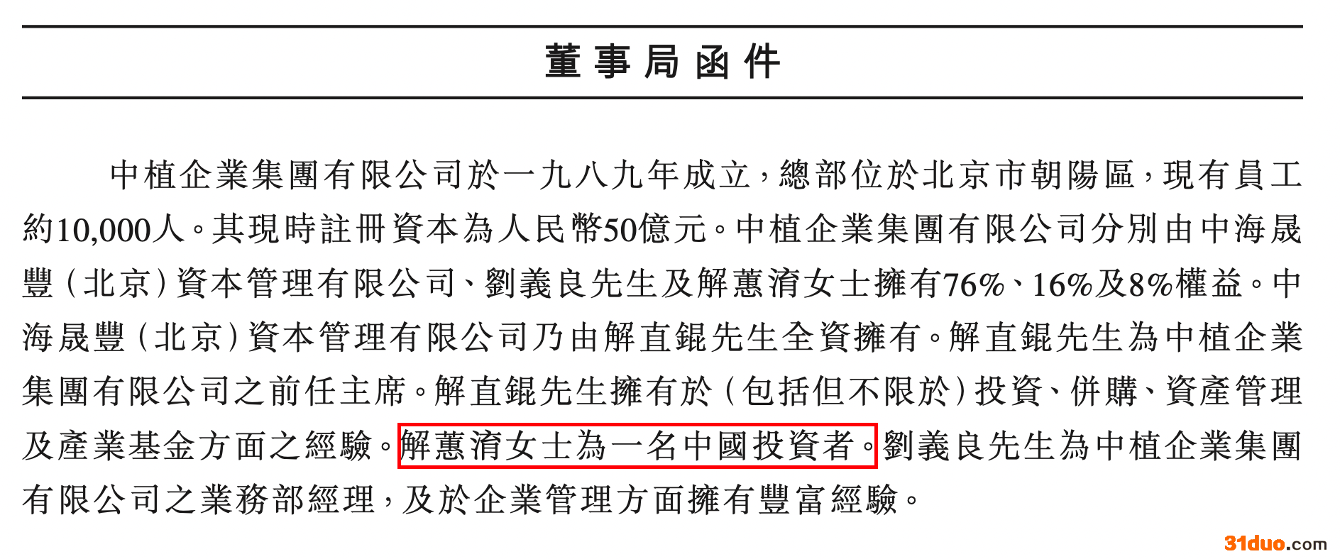 时代财经注意到,“解蕙淯”并未披露过与解直锟的亲属关系。在国华(0370.HK)2015年12月的一则公告中,解蕙淯与解直锟的名字并列,仅简单介绍为“一名中国投资者”。