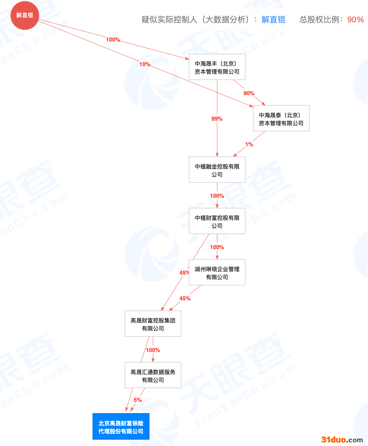 上述文章提到,解茹桐“曾任北京高晟财富公司市场部总监”。天眼查信息显示,北京高晟财富保险代理股份有限公司是不折不扣的“中植系”公司,通过层层穿透,实控人指向的就是解直锟。