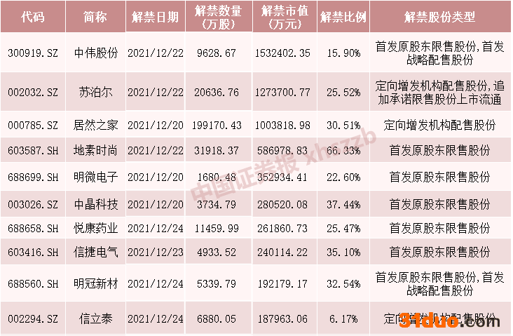 具体来看,中伟股份12月22日将解禁9628.67万股,均为首发原股东限售股份和首发机构配售股份。苏泊尔12月22日将解禁2.06亿股,为定向增发机构配售股份定向增发机构配售股份和追加承诺限售股份。居然之家12月20日将解禁19.92亿股,均为定向增发机构配售股份。