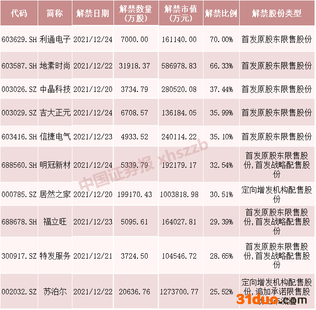 数据显示,在本周面临解禁的63只股票中,有7只股票解禁数量占总股本比例超过30%,分别为利通电子、地素时尚、中晶科技、吉大正元、信捷电气、明冠新材、居然之家,解禁比例分别为70.00%、66.33%、37.44%、35.99%、35.10%、32.54%、30.51%。与当前流通股相比,这7只股票本周解禁后流通盘将分别增加233.33%、202.52%、149.71%、148.75%、54.08%、153.14%、262.16%。