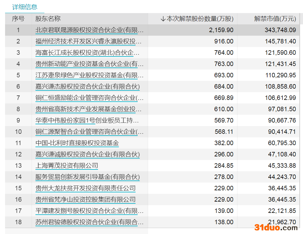本周解禁市值最大的中伟股份,为锂电池正极材料龙头股。解禁的股份来自于北京君联晟源股权投资合伙企业、抚州经济技术开发区兴睿永瀛股权投资合伙企业等18个股东,其中北京君联晟源股权投资合伙企业解禁市值超30亿元,为中伟股份第二大股东。