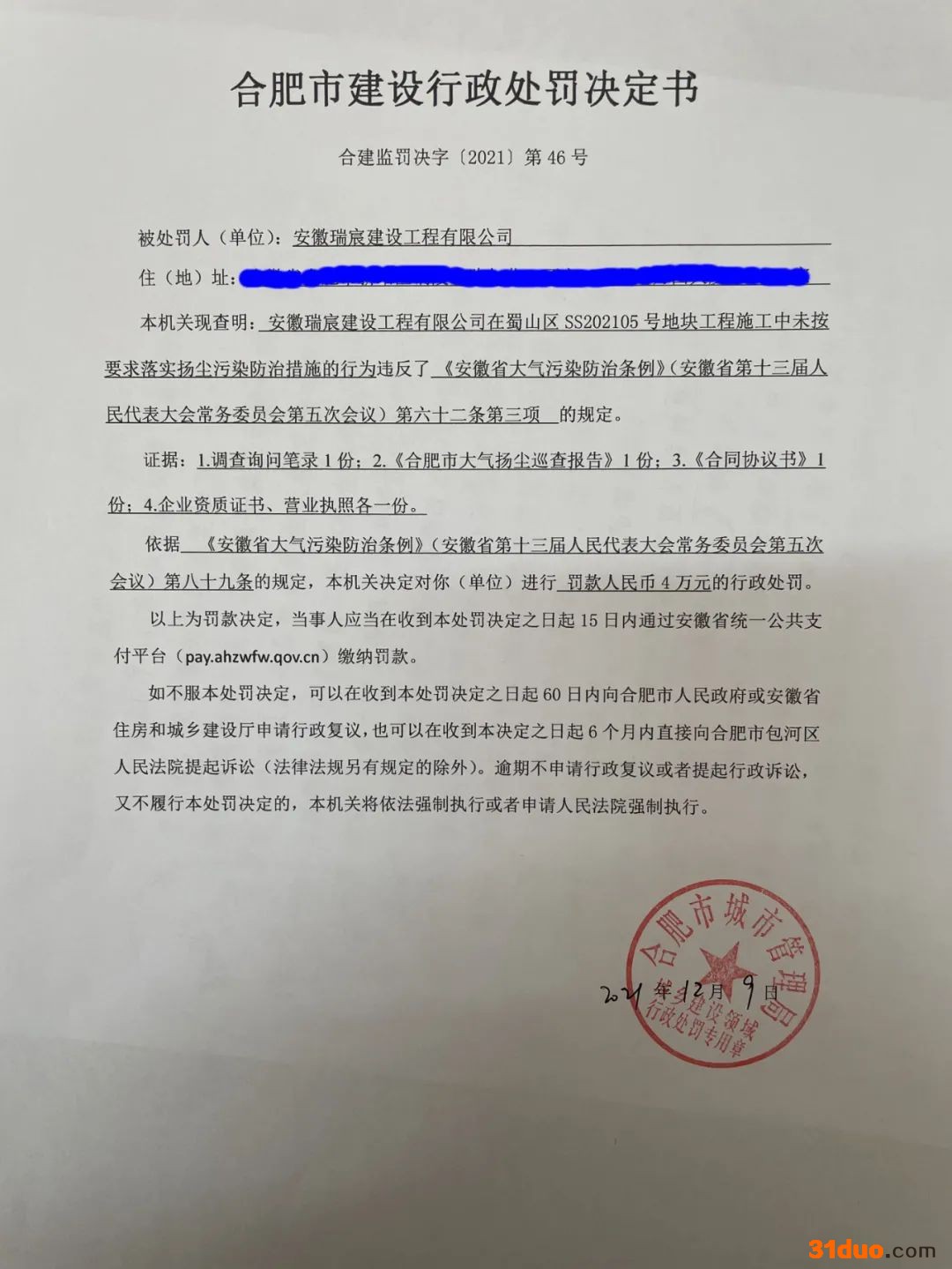 安徽瑞宸建设工程有限公司在蜀山区SS202105号地块工程施工中同样未按要求落实扬尘污染防治措施,违反了《安徽省大气污染防治条例》(安徽省第十三届人民代表大会常务委员会第五次会议)第六十二条第三项的规定,被罚款4万元。