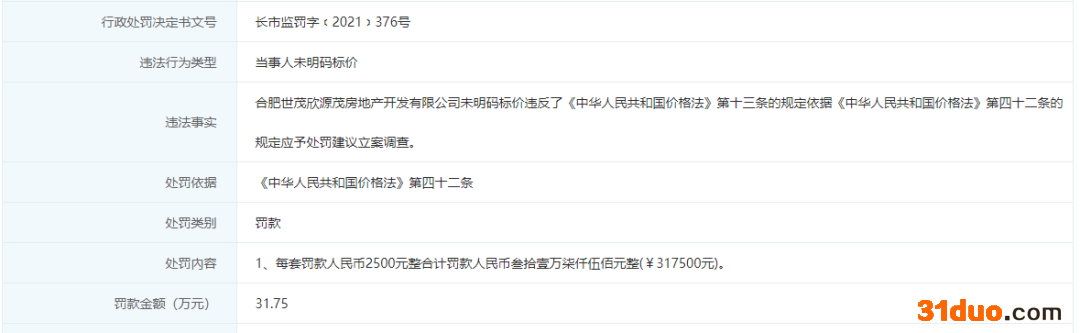 合肥世茂欣源茂房地产开发有限公司则因未明码标价,违反了《中华人民共和国价格法》第十三条的规定,被长丰县市场监督管理局依据《中华人民共和国价格法》第四十二条规定,处以每套罚款人民币2500元,总计31.75万元罚款。