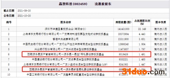 截至2021年9月30日,百亿私募西藏源乐晟资产管理有限公司旗下2只基金现身晶澳科技前十大流通股东。