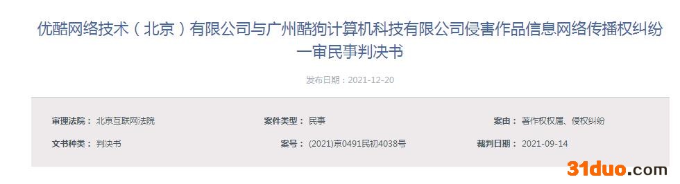 中新经纬12月20日电 据北京法院审判信息网消息,近日,优酷网络技术(北京)有限公司与广州酷狗计算机科技有限公司相关侵害作品信息网络传播权纠纷一审法律文书公布。