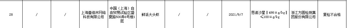 农兽药残留超标问题中,上海壹佰米网络科技有限公司(叮咚买菜)销售的鲜活大头虾,恩诺沙星不符合食品安全国家标准规定,检验结果为498μg/kg,标准值为≤100μg/kg。生产日期为2021年9月7日。检验机构为浙江方圆检测集团股份有限公司。上海壹佰米网络科技有限公司对检验结果提出异议,并申请复检,经浙江省检验检疫科学技术研究院复检后,维持初检结论。