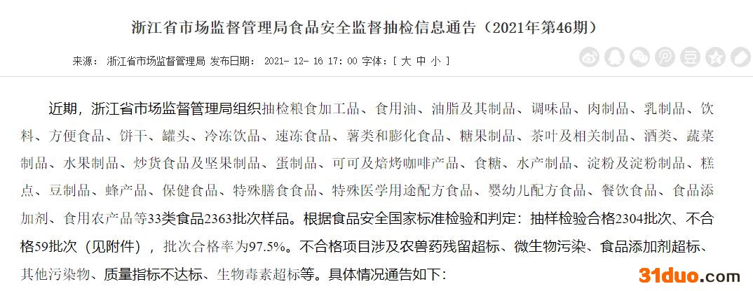 中国经济网北京12月20日讯 近日,浙江省市场监督管理局发布食品安全监督抽检信息通告(2021年第46期)。近期,浙江省市场监督管理局组织抽检粮食加工品、调味品、方便食品、保健食品、特殊膳食食品、特殊医学用途配方食品、婴幼儿配方食品、餐饮食品、食品添加剂、食用农产品等33类食品2363批次样品。根据食品安全国家标准检验和判定:抽样检验合格2304批次、不合格59批次,批次合格率为97.5%。不合格项目涉及农兽药残留超标、微生物污染、食品添加剂超标、其他污染物、质量指标不达标、生物毒素超标等。