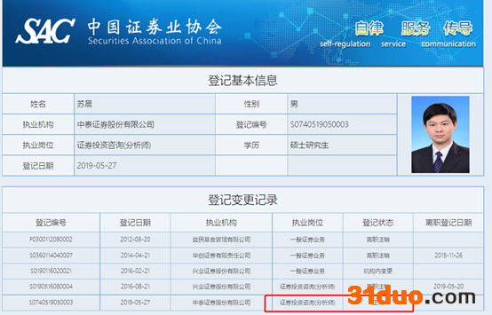 苏晨具备超过5年以上的卖方研究经验,是新能源与电力设备行业的资深分析师,也是新财富榜单前三名的常客。2016年至2019年,苏晨担任兴业证券研究所电新行业首席分析师,2019年5月,苏晨“转会”中泰证券,任研究所副所长、中游制造大组组长、新能源行业首席分析师。协会登记信息上,苏晨目前的执业机构仍显示为中泰证券,登记状态也正常。