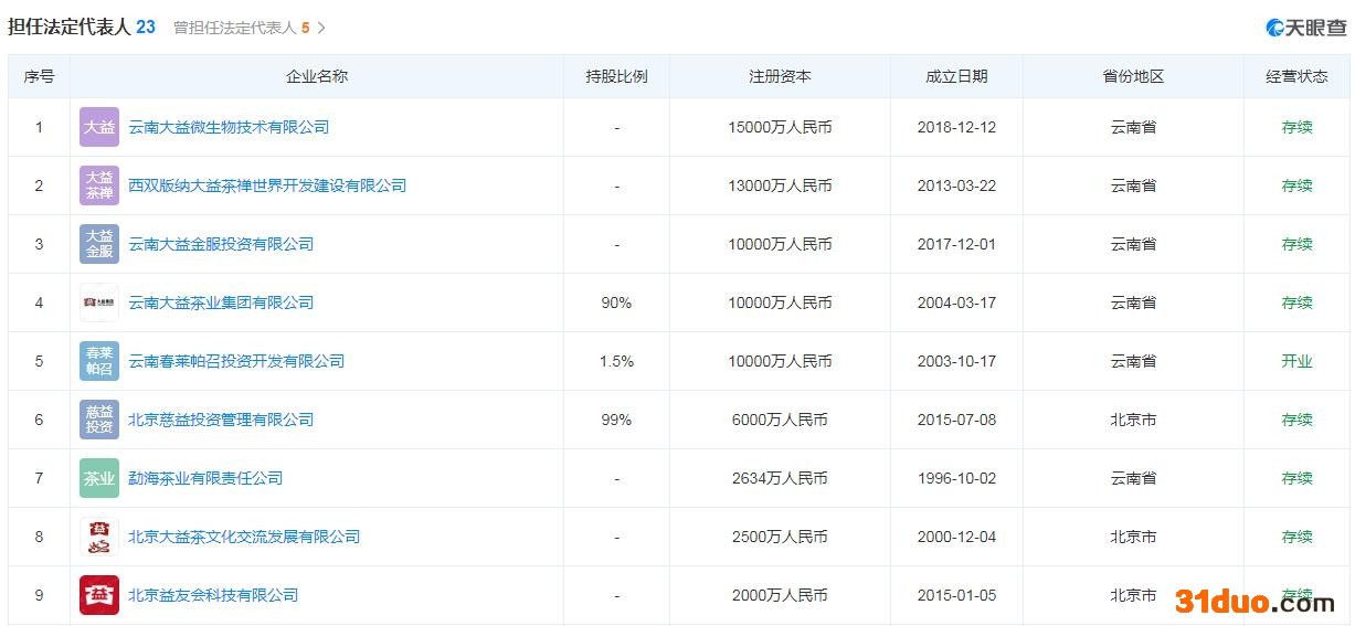 天眼查APP数据显示,吴远之为云南大益茶业集团有限公司最大股东,持股比例为90%。此外,吴远之还担任云南大益微生物技术有限公司、西双版纳大益茶茶禅世界开发建设有限公司等23家公司的法人代表。