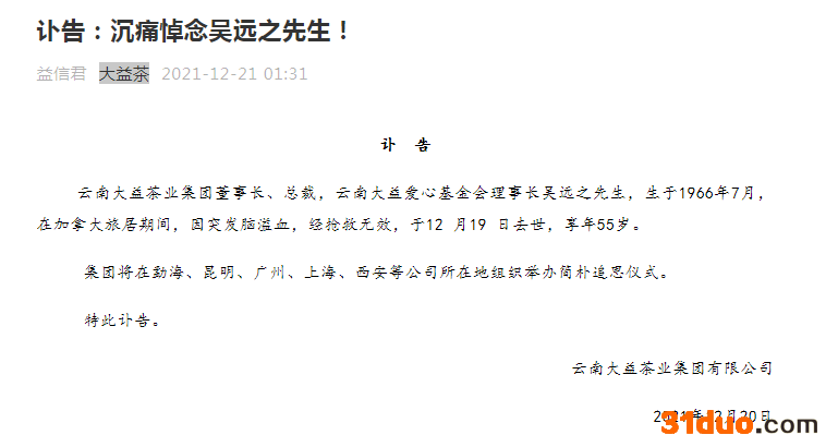 据大益茶官方微信号12月21日凌晨消息,云南大益茶业集团董事长、总裁,云南大益爱心基金会理事长吴远之先生,生于1966年7月,在加拿大旅居期间,因突发脑溢血,经抢救无效,于12月19日去世,享年55岁。