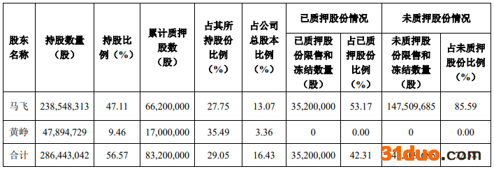 马飞此次股份质押2220.00万股,占其所持股份比例9.31%,占公司总股本比例4.38%,质押用途为个人资金需求。