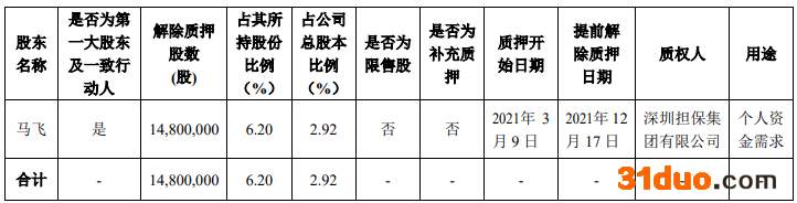 其中,马飞此次股份解除质押1480.00万股,占其所持股份比例6.20%,占公司总股本比例2.92%。