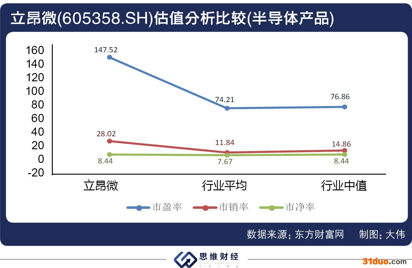 截至12月17日,立昂微的市值达到了622.8亿元。从估值来看,立昂微的市盈率达到了147.52倍,市销率为28.02倍,市净率为8.44倍,远高于行业的平均水平,也处于行业的中值以上。