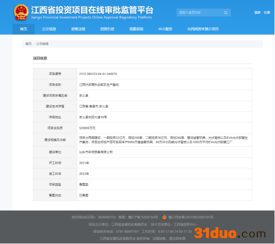 备案项目总投资52亿元,分两期建设,一期投资22亿元,用地200亩,二期投资30亿元,用地200亩。备案信息显示,将建设益智玩具、光伏背板以及EVA光伏胶膜生产基地,项目达标投产后可实现年产8000万套益智玩具、60万件太阳能光伏背板以及1000万平方EVA光伏胶膜工厂。