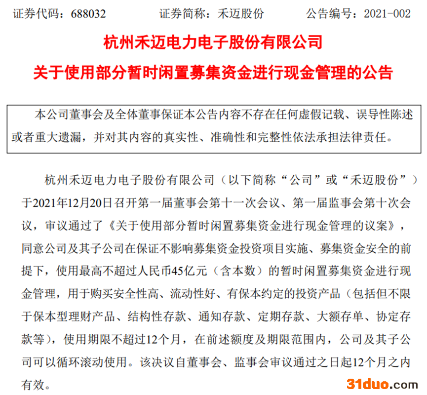 财联社12月20日讯,今日晚间,禾迈股份公告,拟使用最高不超过45亿元暂时闲置募集资金进行现金管理,用于购买安全性高、流动性好、有保本约定的投资产品。
