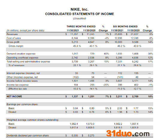 第二财季内,耐克直接销售额为47亿美元,同比增长9%;线上销售额(NIKE Brand Digital )增长了12%。