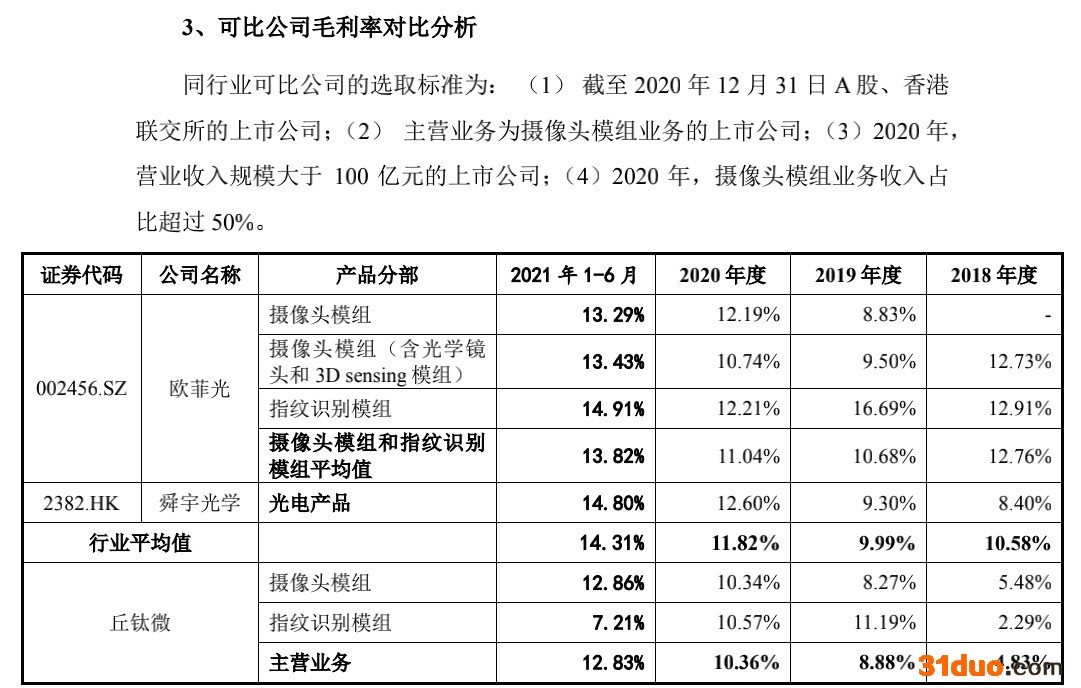 “上述可比公司具有更强的规模效应及更高的产品附加值等,因此可比公司的毛利率水平略高于公司。”鉴于欧菲光和舜宇光学在摄像头模组领域的规模大于丘钛微,客户结构、产品结构与丘钛微存在差异,同时欧菲光在指纹识别模组领域的规模大于丘钛微。