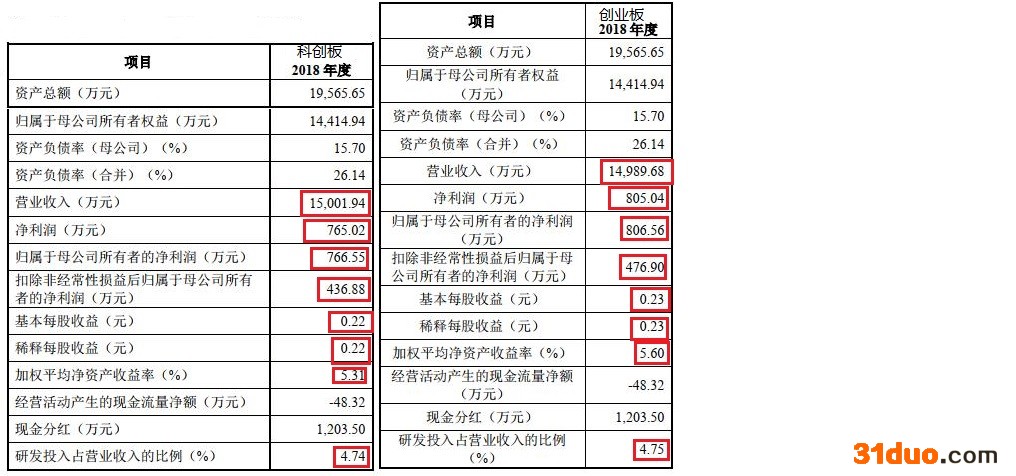 可以看到,其在创业板披露的2018年营业收入、净利润、归属净利润、扣非后净利润、每股收益、加权平均净资产收益率以及研发占比等数据,均有些许差异。