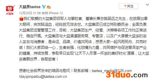 中新经纬12月21日电 据云南大益茶业集团有限公司微博“大益茶taetea”20日消息,大益集团董事长兼总裁吴远之在旅居加拿大期间,突发脑溢血,经抢救无效去世。