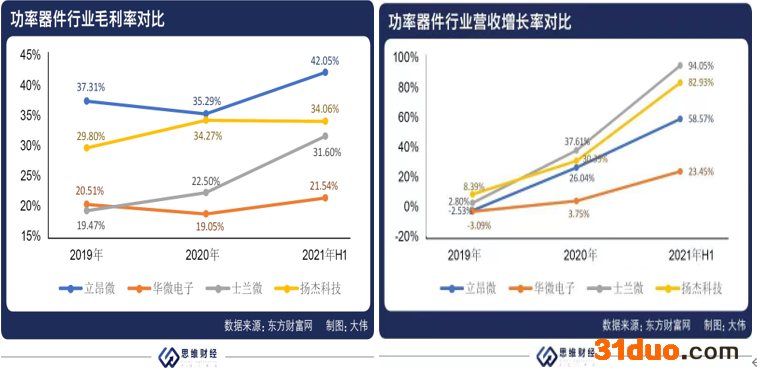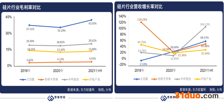 通过对比梳理《投资者网》发现,立昂微在硅片业务的主要竞争对手包括有研半导体、中环股份和沪硅产业,其中立昂微的毛利率水平远超竞争对手,营业增速也名列前茅,原因主要是公司较早布局了6英寸和8英寸硅片的生产线建设,产能技改得到提升,能够有效满足市场需求,同时公司的12英寸硅片研发也得到重大突破,目前已实现批量出货,预计今年年底将实现年产180万片规模的产能,现正处于产能快速爬坡阶段。