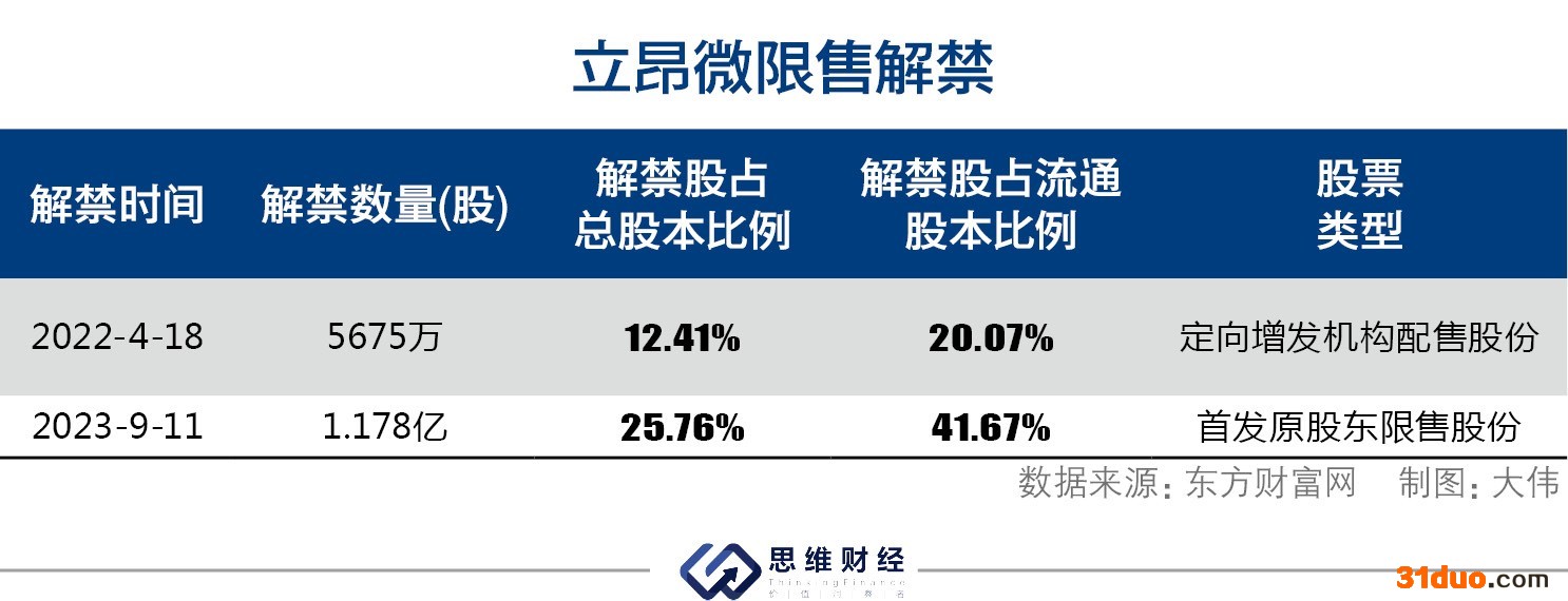 三.巨额解禁引发市值波动风险。立昂微在今年9月迎来了超过300亿元的巨额限售股解禁,公司股价当时出现连续两天跌停,市值蒸发了近百亿。据东方财富网信息,立昂微在2022年和2023年分别还有占总股本比例12.41%和25.76%的解禁股,投资者也需要关注未来一段时间内的限售股解禁消息。