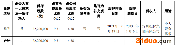 马飞此次股份质押2220.00万股,占其所持股份比例9.31%,占公司总股本比例4.38%,质押用途为个人资金需求。