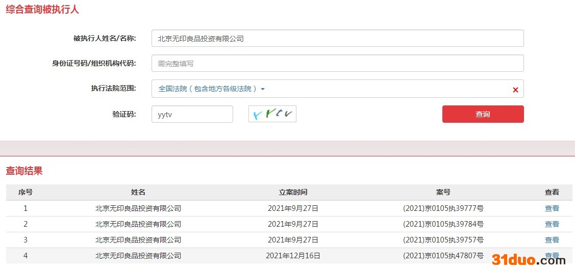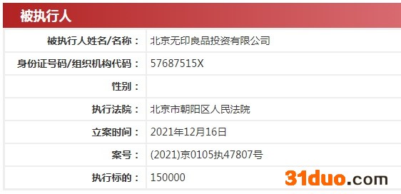 中新经纬12月20日电 中国执行信息公开网显示,近日,北京无印良品投资有限公司(简称“北京无印良品”)新增一条被执行人信息,执行标的15万元,执行法院为北京市朝阳区人民法院,案号为(2021)京0105执47807号。