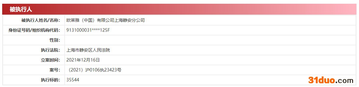 中国经济网北京12月20日讯 近日,执行信息公开网显示,欧莱雅(中国)有限公司上海静安分公司新增被执行人信息,案号(2021)沪0106执23423号,执行标的3.55万元,立案日期为2021年12月16日,执行法院为上海市静安区人民法院。