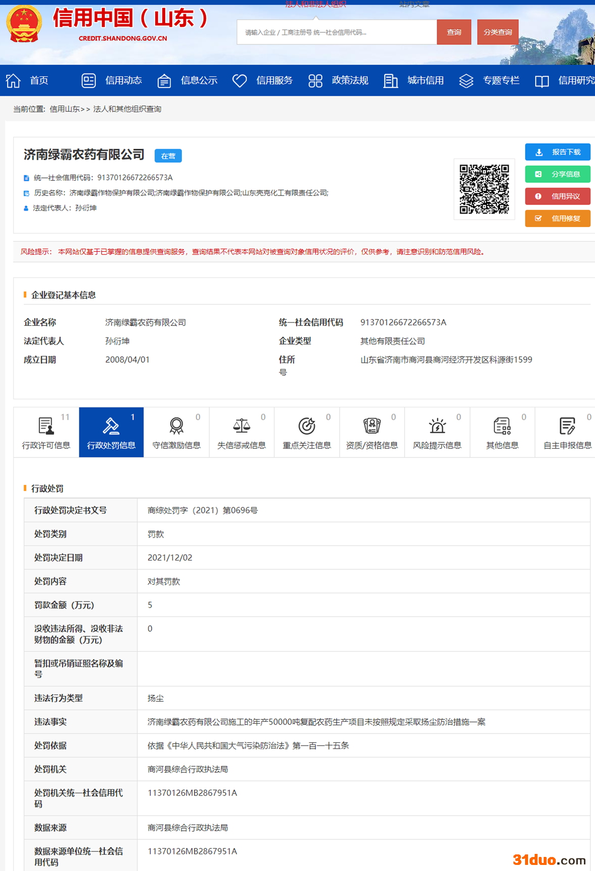 中国经济网北京12月20日讯 近日,信用中国(山东)网站公示了一则关于济南绿霸农药有限公司的行政处罚信息。该行政处罚决定书(商综处罚字(2021)第0696号)显示,济南绿霸农药有限公司施工的年产50000吨复配农药生产项目未按照规定采取扬尘防治措施,上述违法行为类型为“扬尘”。依据《中华人民共和国大气污染防治法》第一百一十五条,商河县综合行政执法局对该公司处以罚款5万元,处罚决定日期为2021年12月2日。