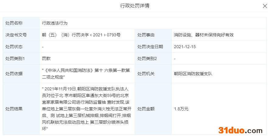 行政处罚决定书(朝(五)(消)行罚决字﹝2021﹞0793号)显示,2021年11月19日,朝阳区消防救援支队执法人员对位于北京市朝阳区阜通东大街59号的北京宜家家居有限公司进行消防监督抽查时发现,该单位地上第三层东侧一处室外消火栓无法正常开启、测试地上第三层机械排烟,排烟阀打开,排烟风机联锁无法启动且地上 第三层部分喷淋头损坏,违反《中华人民共和国消防法》第十六条第一款第二项之规定,朝阳区消防救援支队依法对其罚款1.85万元,处罚日期为2021年12月15日。