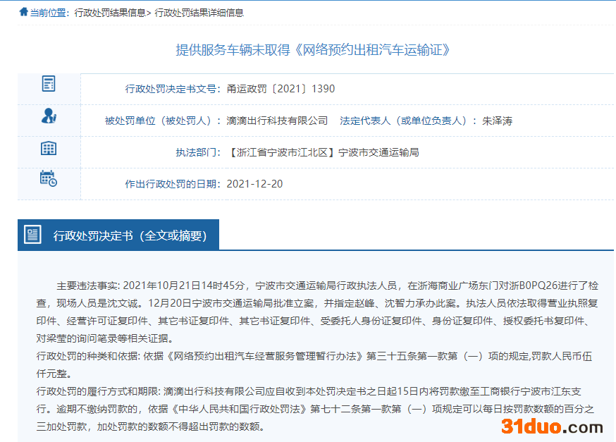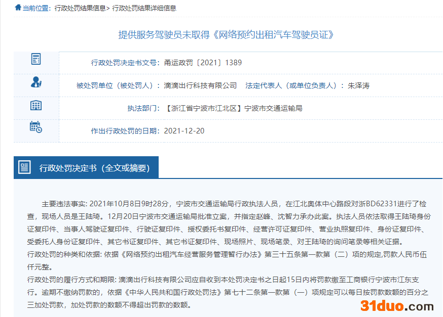行政处罚决定书(甬运政罚〔2021〕1389)显示,主要违法事实为,2021年10月8日9时28分,宁波市交通运输局行政执法人员,在江北奥体中心路段对浙BD62331进行了检查,现场人员是王陆琦。12月20日宁波市交通运输局批准立案。依据《网络预约出租汽车经营服务管理暂行办法》第三十五条第一款第(二)项的规定,宁波市交通运输局对滴滴出行科技有限公司罚款人民币伍仟(5000)元整。