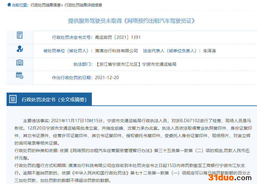 行政处罚决定书(甬运政罚〔2021〕1391)显示,主要违法事实为,2021年11月17日10时15分,宁波市交通运输局行政执法人员,对浙B.D67102进行了检查,现场人员是马彬纹。12月20日宁波市交通运输局批准立案。依据《网络预约出租汽车经营服务管理暂行办法》第三十五条第一款第(二)项的规定,宁波市交通运输局对滴滴出行科技有限公司罚款人民币伍仟(5000)元整。