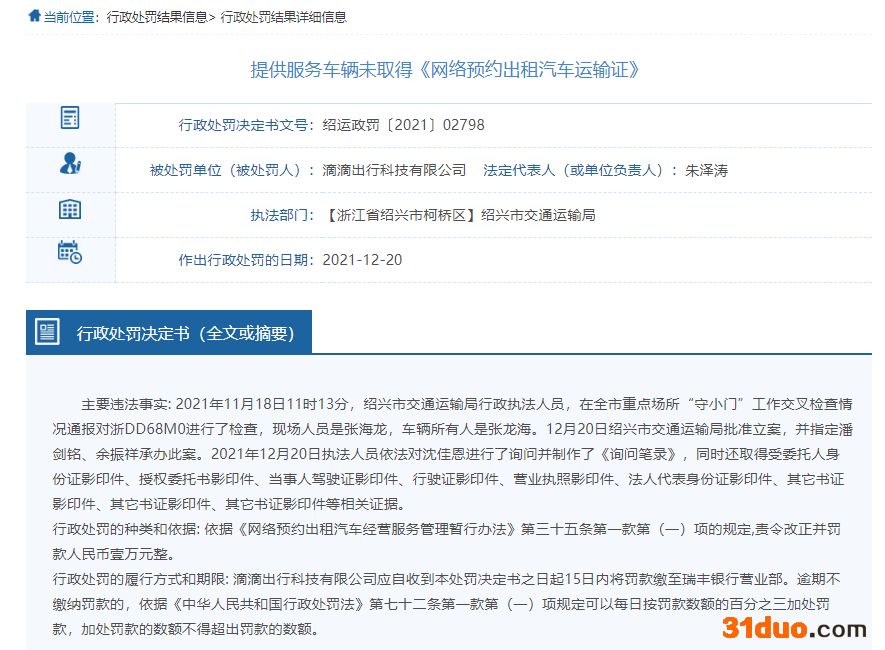 其中,行政处罚决定书(绍运政罚〔2021〕02798)显示,主要违法事实为,2021年11月18日11时13分,绍兴市交通运输局行政执法人员,在全市重点场所“守小门”工作交叉检查情况通报对浙DD68M0进行了检查,现场人员是张海龙,车辆所有人是张龙海。12月20日绍兴市交通运输局批准立案。依据《网络预约出租汽车经营服务管理暂行办法》第三十五条第一款第(一)项的规定,绍兴市交通运输局对滴滴出行科技有限公司责令改正并罚款人民币壹(1)万元整。