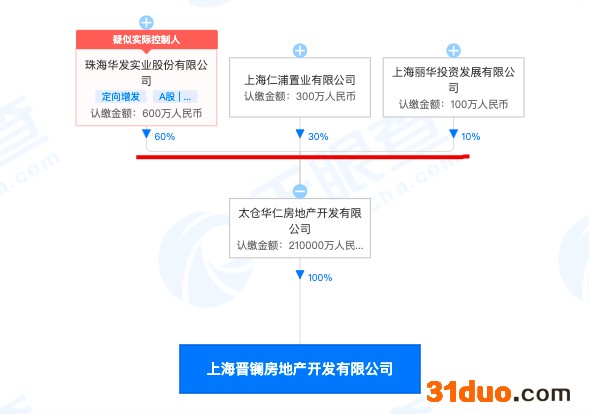 中华网财经从天眼查查询了解到,透过穿透股权关系,上海晋镧房地产开发有限公司是太仓华仁房地产有限公司全资子公司。后者为珠海华发实业股份有限公司(简称:华发股份)控股60%的控股子公司。