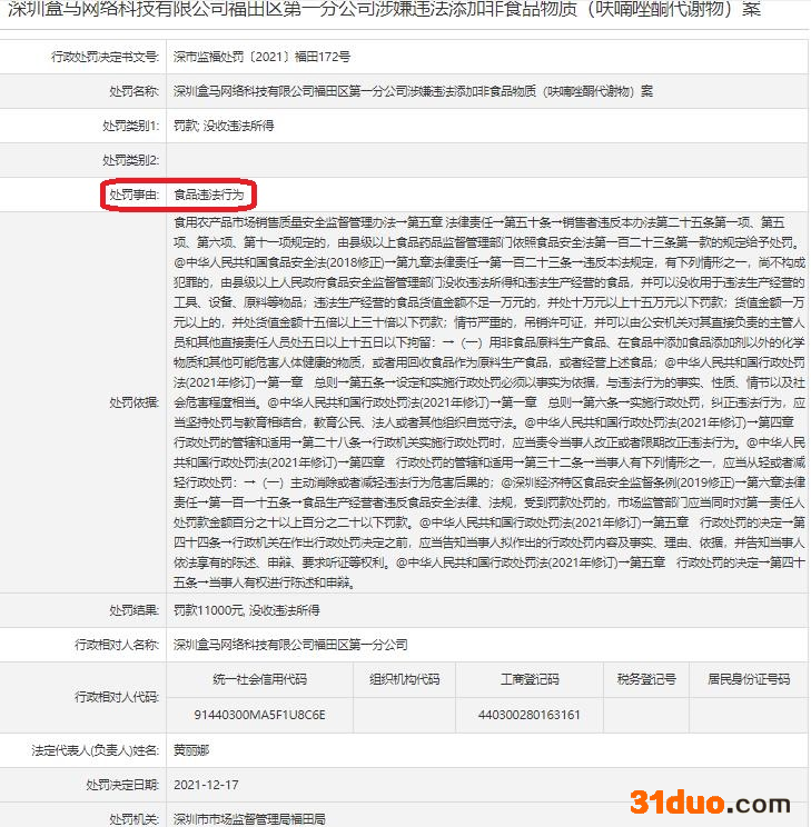 经查,深圳盒马网络科技有限公司福田区第一分公司存在食品违法行为,深圳市市场监督管理局福田局依据,对其罚款1.1万元,处罚日期为2021年12月17日。