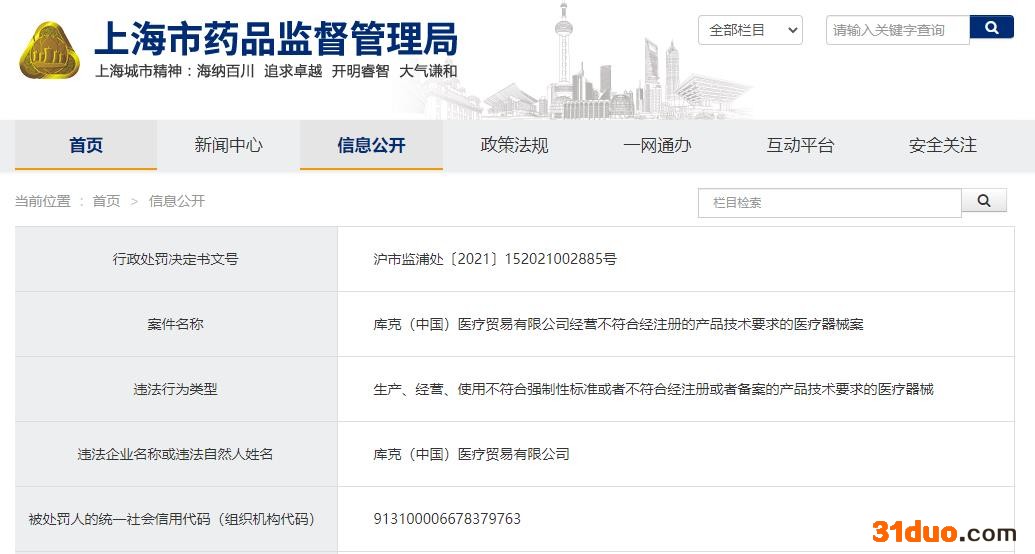 中国经济网北京12月21日讯 近日,上海市浦东新区市场监督管理局网站发布行政处罚决定书(沪市监浦处〔2021〕152021002885号)。当事人库克(中国)医疗贸易有限公司经营的“双猪尾硅胶输尿管支架(规格型号:133626,生产日期:2020-10-26,产品编号/批号:13512726,生产单位:Cook Incorporated库克公司)”,产品注册证号:国械注进20173460395,于2021年3月15日由国家药品监督管理局委托山西省药品监督管理局在山西某医院被抽样检验。