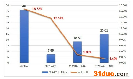 据公司近日发布的三季报数据披露,今年前三季度,丽人丽妆营业收入为25.01亿元,同比仅实现1.49%的增长,相较于2020年18.72%的同比增速缩水超17个百分点。其中,第三季度该公司的营收同比下滑2.15%至6.45亿元。
