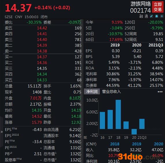二级市场方面,游族网络21日收涨0.14%报每股14.37元,近5个交易日跌3.04%,现总市值132亿元。(中新经纬APP)