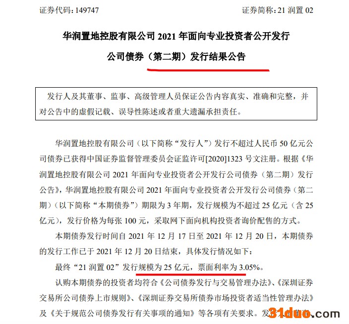 本期债券发行时间自12月17日至12月20日,本期债券的发行工作已于12月20日结束,最终“21润置02”发行规模为25亿元,票面利率为3.05%。