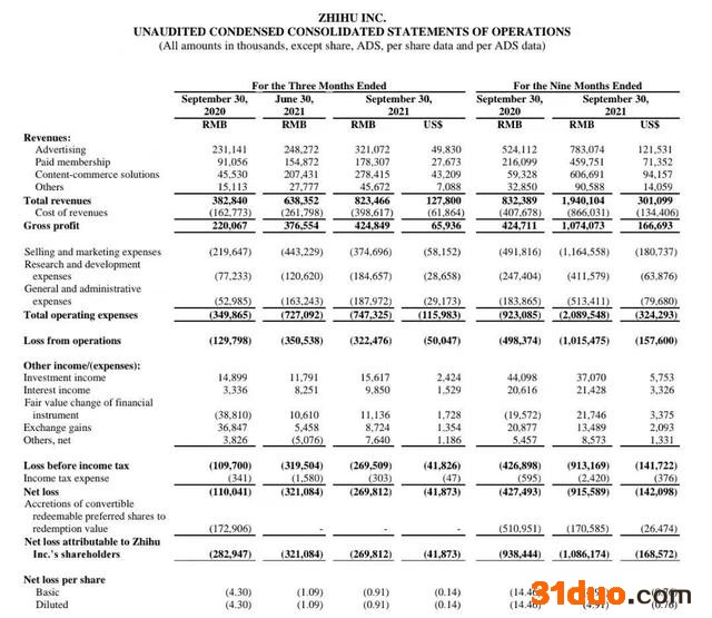 据知乎Q3财报显示,知乎三季度净亏损为2.698亿元,相较去年同期同比扩大145%;不按美国通用会计准则(non-GAAP),调整后的净亏损为1.124亿元,超过去年同期的“净亏损7920万元”。