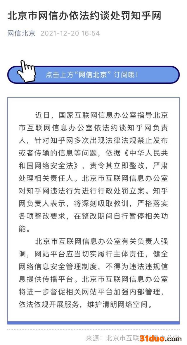 12月20日,“网信北京”通报,因多次出现法律法规禁止发布或者传输的信息等问题,知乎网被北京市互联网信息办公室约谈责令整改。
