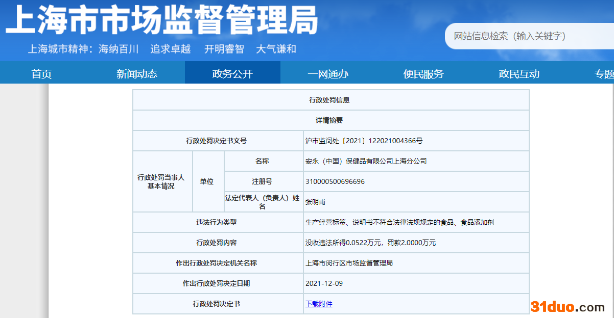 中国经济网北京12月21日讯近日,上海市市场监督管理局网站公示的一则行政处罚决定书显示,安永(中国)保健品有限公司上海分公司