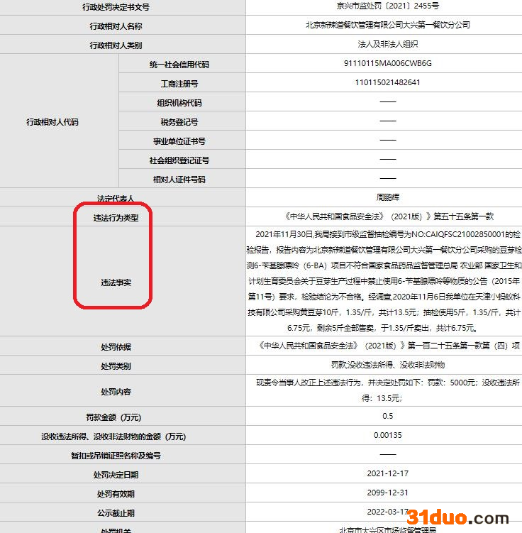 中国经济网北京12月21日讯 北京市市场监督管理局网站日前公布的行政处罚决定书(京兴市监处罚〔2021〕2455号)显示,2021年11月30日,北京市市场监督管理局接到市级监督抽检编号为NO:CAIQFSC21002850001的检验报告,报告内容为北京新辣道餐饮管理有限公司大兴第一餐饮分公司采购的豆芽检测6-苄基腺嘌呤(6-BA)项目不符合国家食品药品监督管理总局农业部国家卫生和计划生育委员会关于豆芽生产过程中禁止使用6-苄基腺嘌呤等物质的公告(2015年第11号)要求,检验结论为不合格。